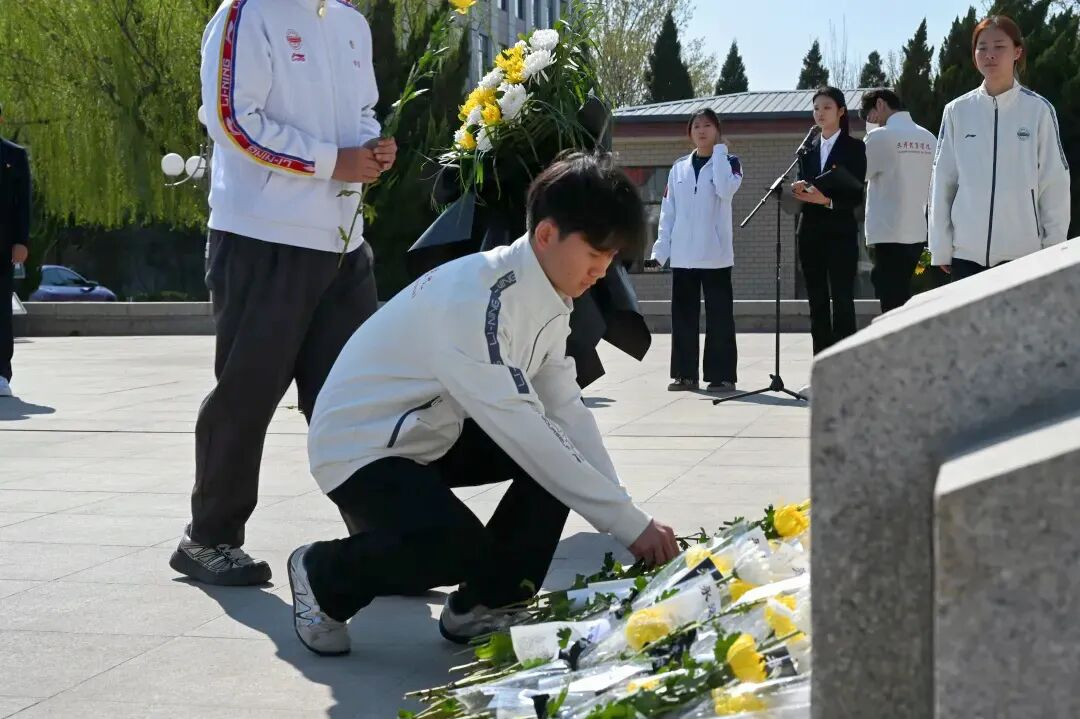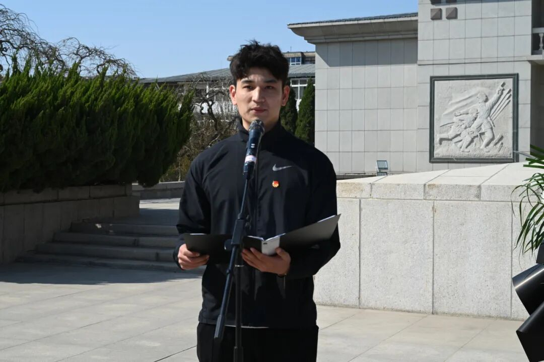 活动现场,李腾同学作为学生代表进行发言,他表示今天的祭扫是一次深刻的思想洗礼,提醒青年学生要把英烈精神融入体育赛场,将缅怀之情转化为训练场上的每一次拼搏;把英烈精神化为时代担当,在强国建设中贡献青春力量;把英烈精神刻进团员初心,时刻牢记共青团员的责任与使命。