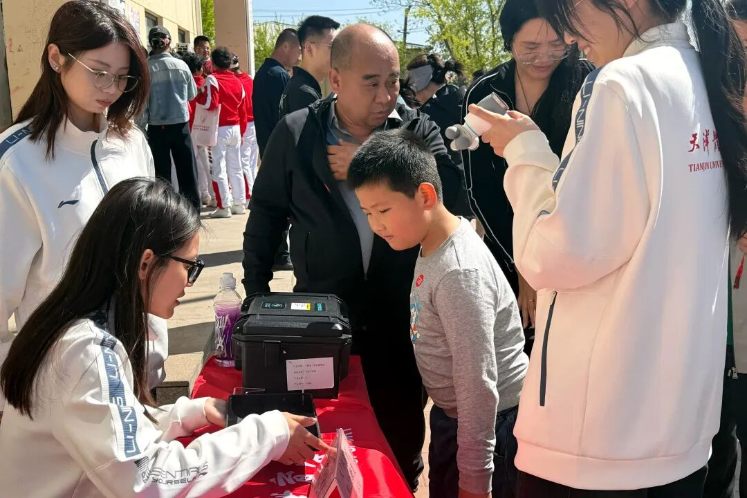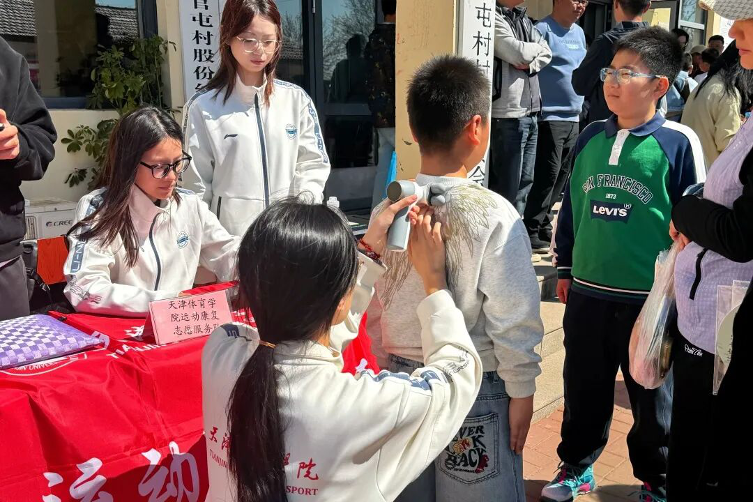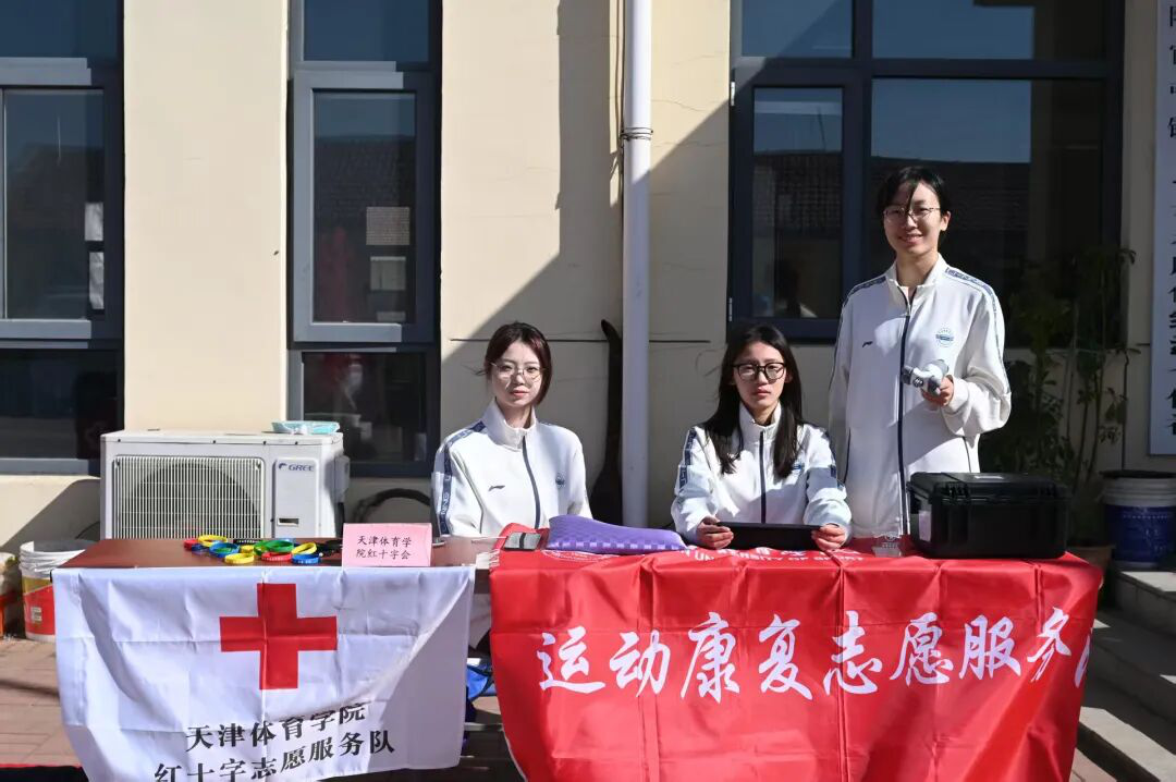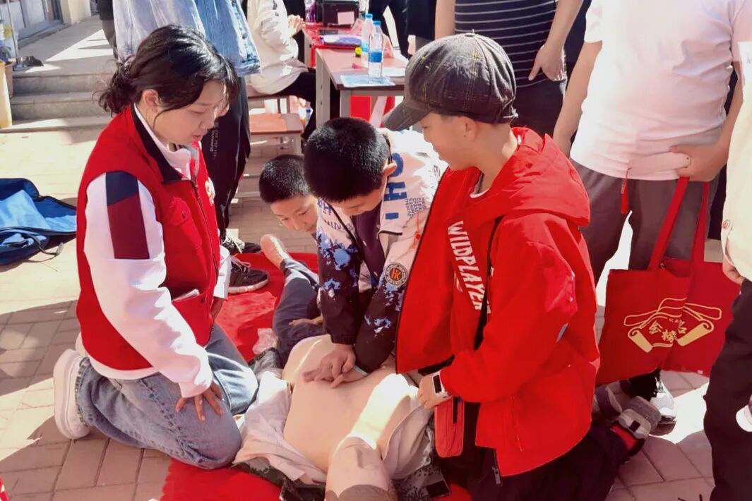 在比赛终点处,我校运动康复志愿服务队进行青少年脊柱侧弯免费检测,用专业知识守护青少年健康成长。此外,我校红十字会社团志愿者们,手把手指导群众掌握心肺复苏实操技能,将急救知识转化为守护生命的实用能力。