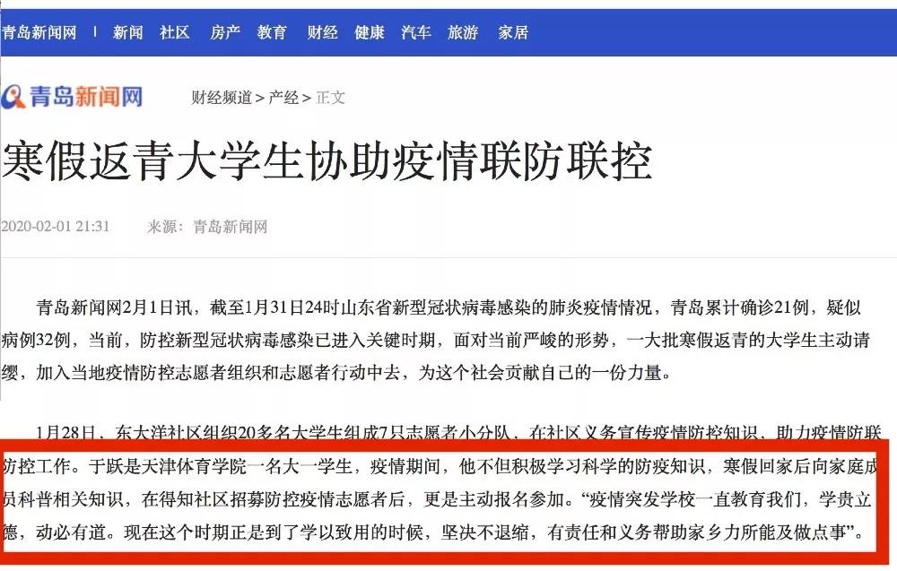 作为天津体育学院体育教育专业的学生,于跃更是发挥自己的特长,呼吁居民适当进行室内体育活动,增加抵抗力,正确的生活习惯和适当的健身提高免疫力是预防病毒的重要途径之一;身体是革命的本钱,健康的身体是打赢这场防控战的保障。他的事迹被青岛新闻网报道。