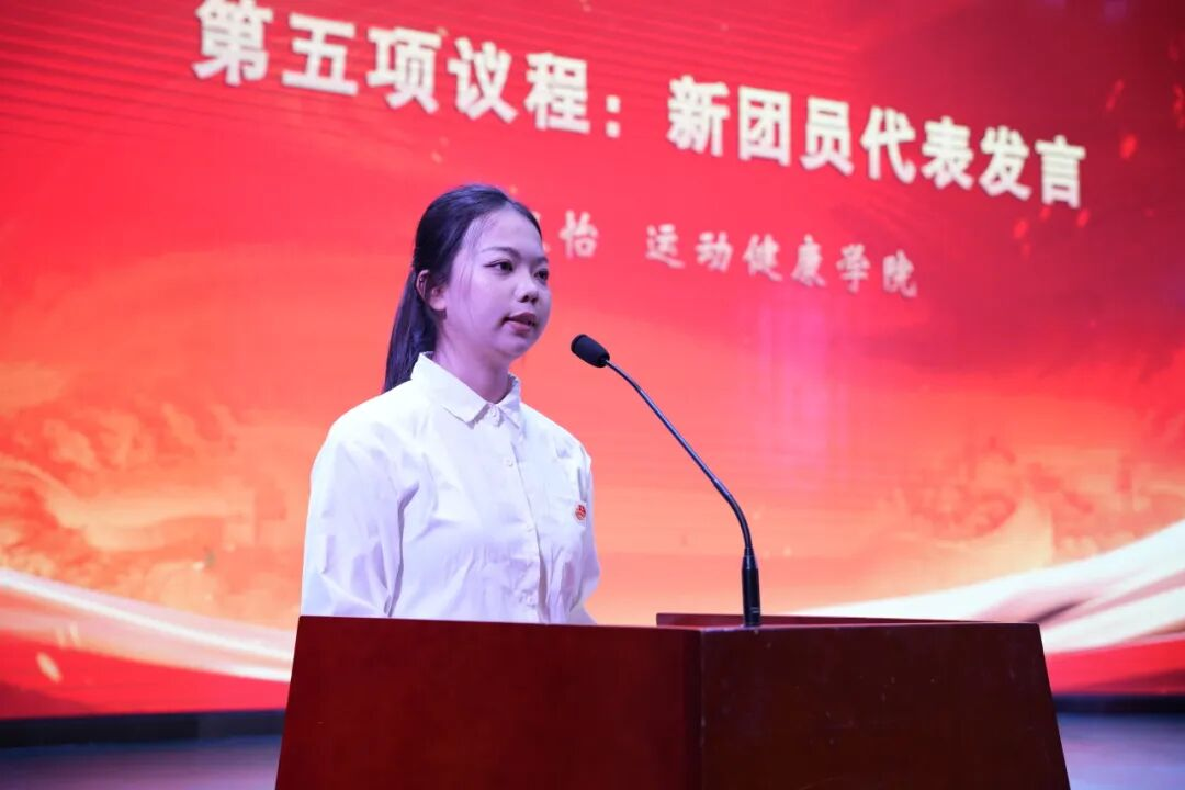 新团员代表运动健康学院刘双怡同学在发言中郑重承诺,将牢记共青团作为“党的助手和后备军”的政治属性,坚定不移听党话、跟党走,努力做有理想、敢担当、能吃苦、肯奋斗的新时代好青年。