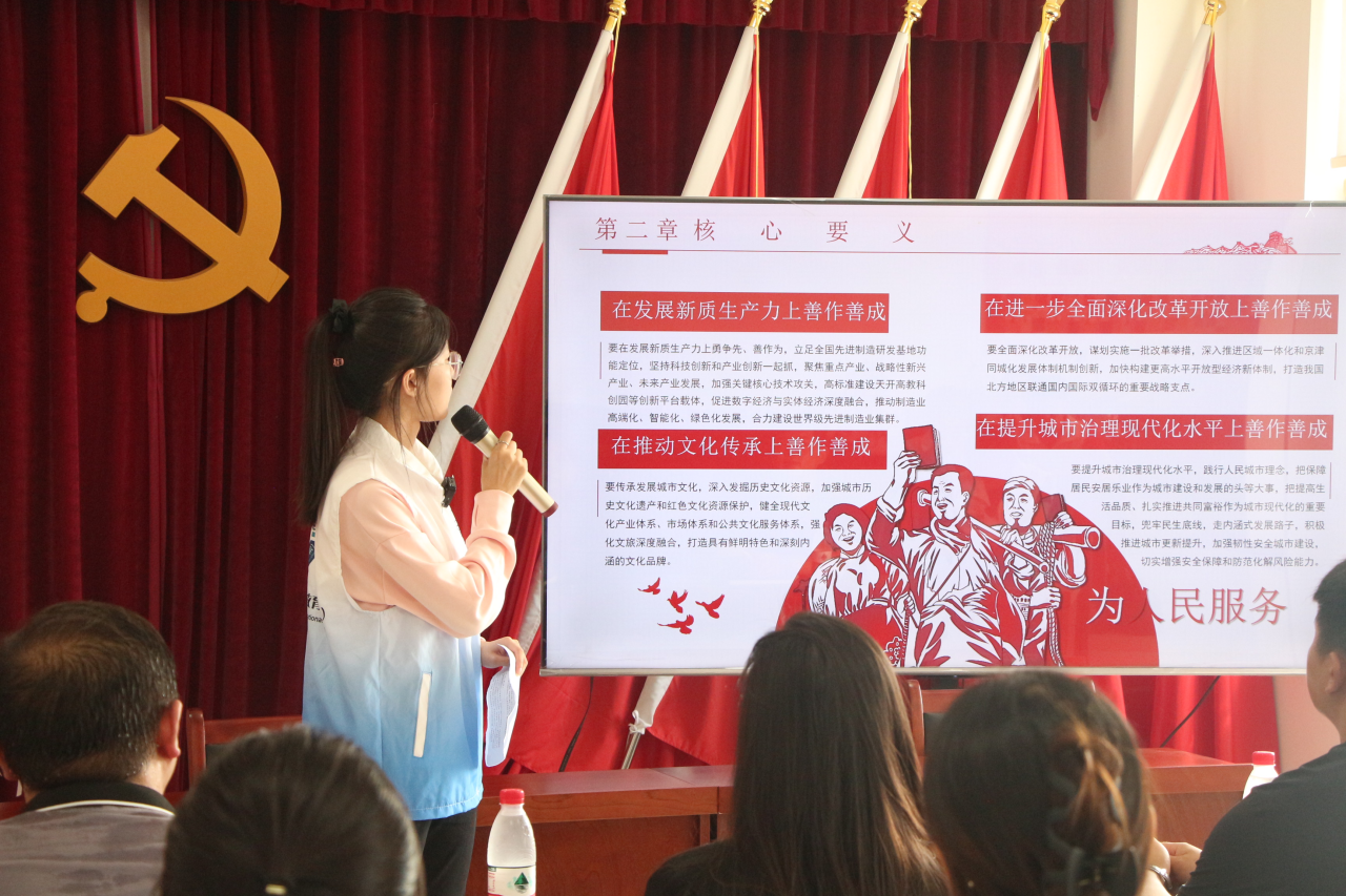 为增强党的创新理论宣讲吸引力和感染力,实践团探索宣讲新模式,宣讲内容由“单一枯燥”向“丰富多样”转变,宣讲主体由“一人讲”向“多人讲”转变,宣讲形式充分利用专业特长、视频、表演等模式,打通党的创新理论宣讲宣传“最后一公里”。在瞿阝里村,实践团成员带领现场群众一起重温了习近平总书记视察天津的相关视频,运用专业舞蹈、PPT和视频重点介绍了 “四个善作善成”的内涵。村民们表示,通过聆听特别的宣讲,深刻领会了习近平总书记视察天津重要讲话的重大意义和丰富内涵。