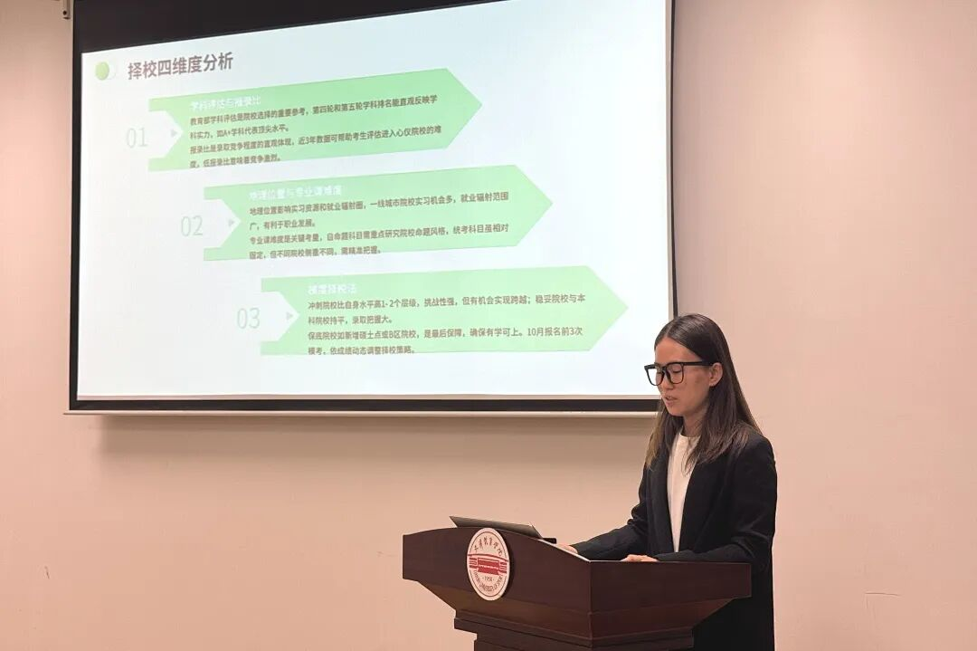 随后,张文秀同学则从考研全流程的角度出发,用风趣幽默的语言为同学们提供了全面的备考指南。她详细解读了院校选择策略、考前准备阶段、高效备考方案、复试通关指南以及调剂流程详解等关键环节,让同学们对考研有了更加清晰的认识和规划。